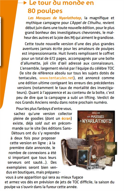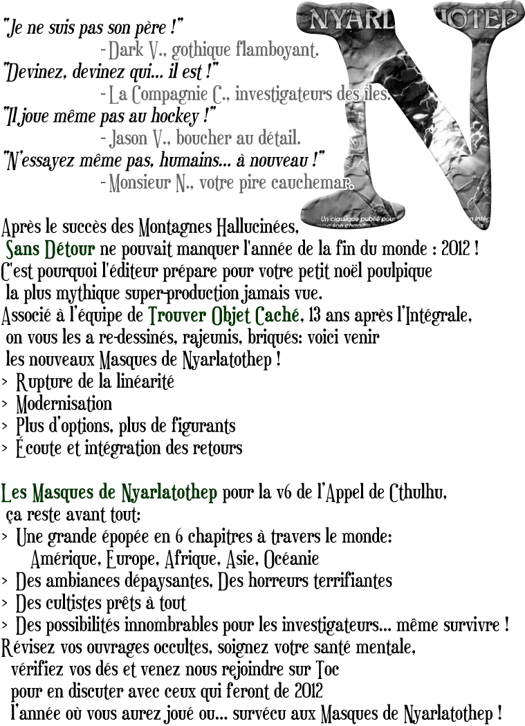 • Enfin une page pour aider les gardiens qui veulent se lancer dans la maîtrise de la fameuse campagne des Masques de Nyarlathotep.